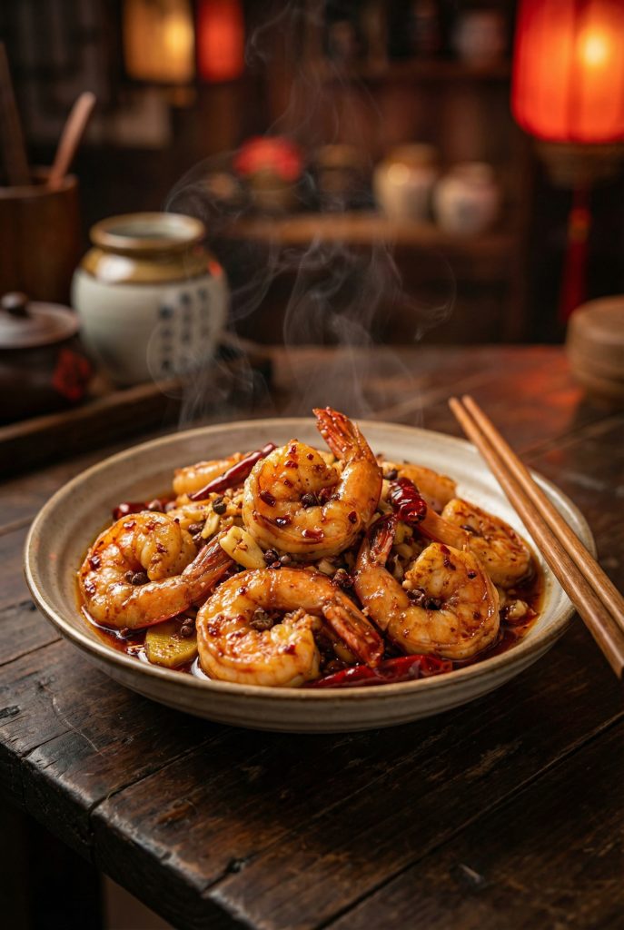 Shrimp cook in 3 minutes. Overcooking is the only danger. Szechuan peppercorns do the rest.