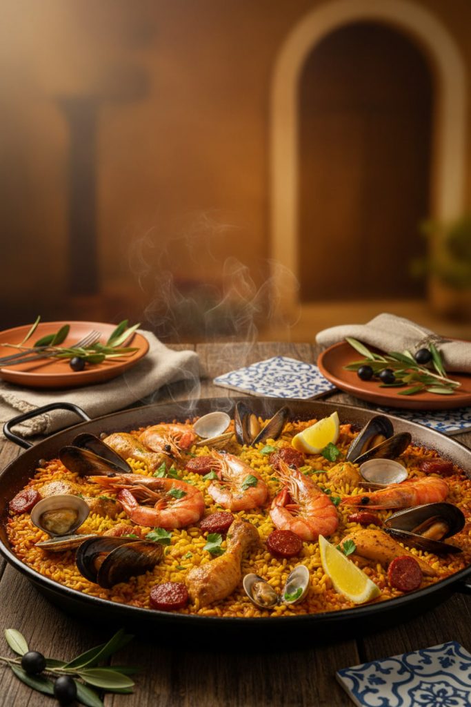 Paella is Spain’s most famous rice dish, traditionally cooked in a wide pan with seafood, meat, or vegetables.