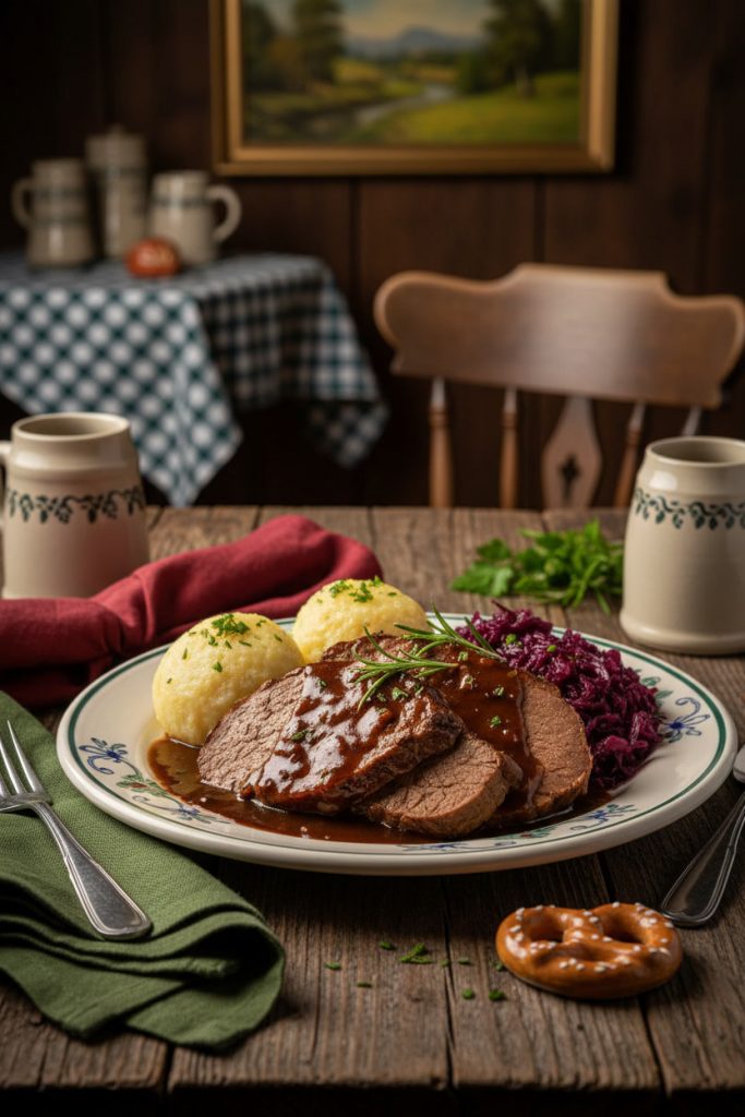 Sauerbraten is a classic German pot roast that is marinated for days and slow-cooked until tender. Its sweet-and-sour flavor makes it one of Germany’s most famous traditional meals.