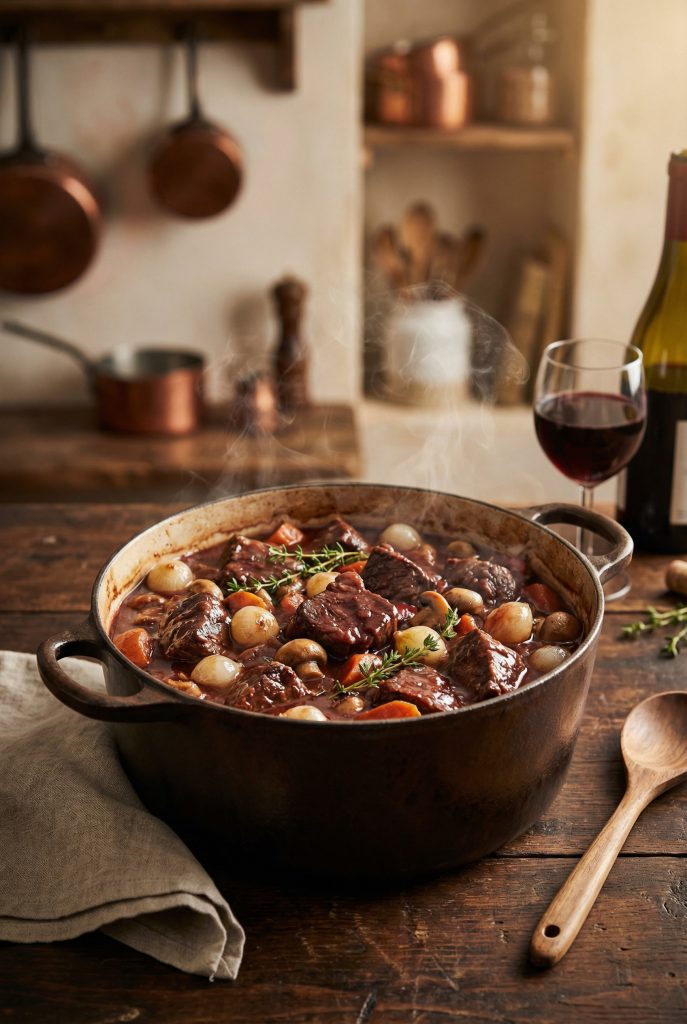 This classic French stew features beef slowly braised in red wine with vegetables and herbs. It’s elegance in a bowl.