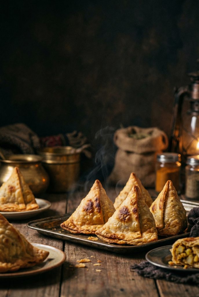 Golden triangles, warm with spice. Samosas last because they travel well, across streets, cultures, and kitchens. Filled with potatoes, peas, or lentils, they’re comforting without being heavy.