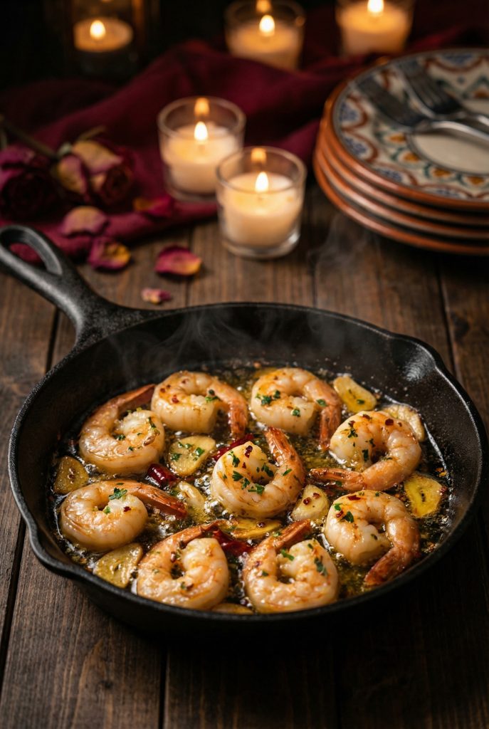Shrimp sizzling in garlic and olive oil creates an intimate atmosphere.