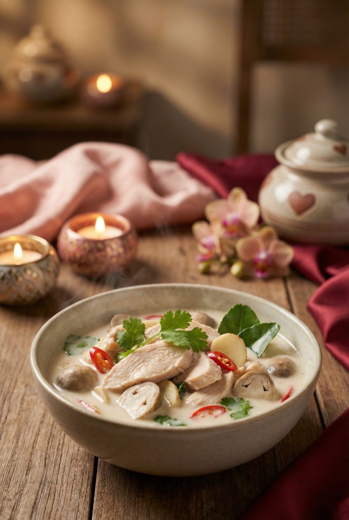 Creamy coconut milk with tender chicken and herbs feels soothing and light.
