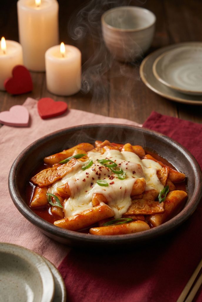 Chewy rice cakes in spicy sauce with melted cheese. Itโs the ultimate comfort food.
